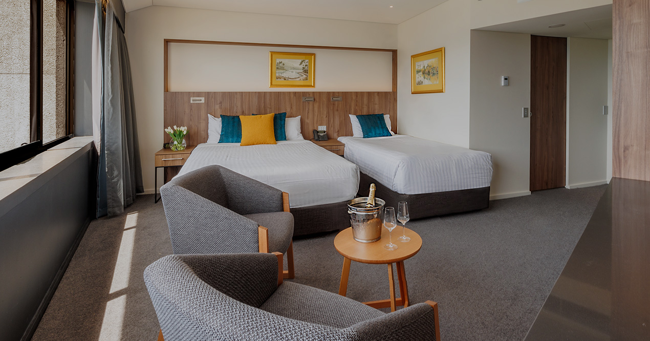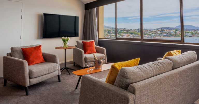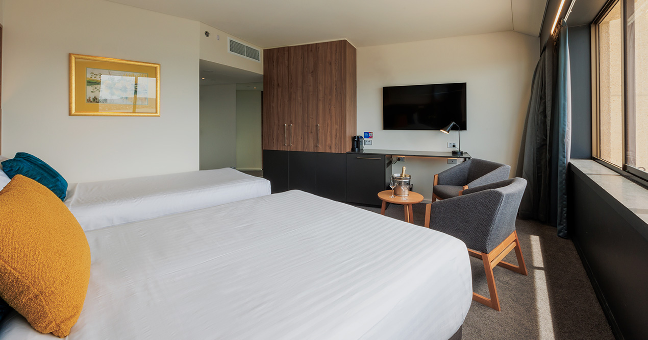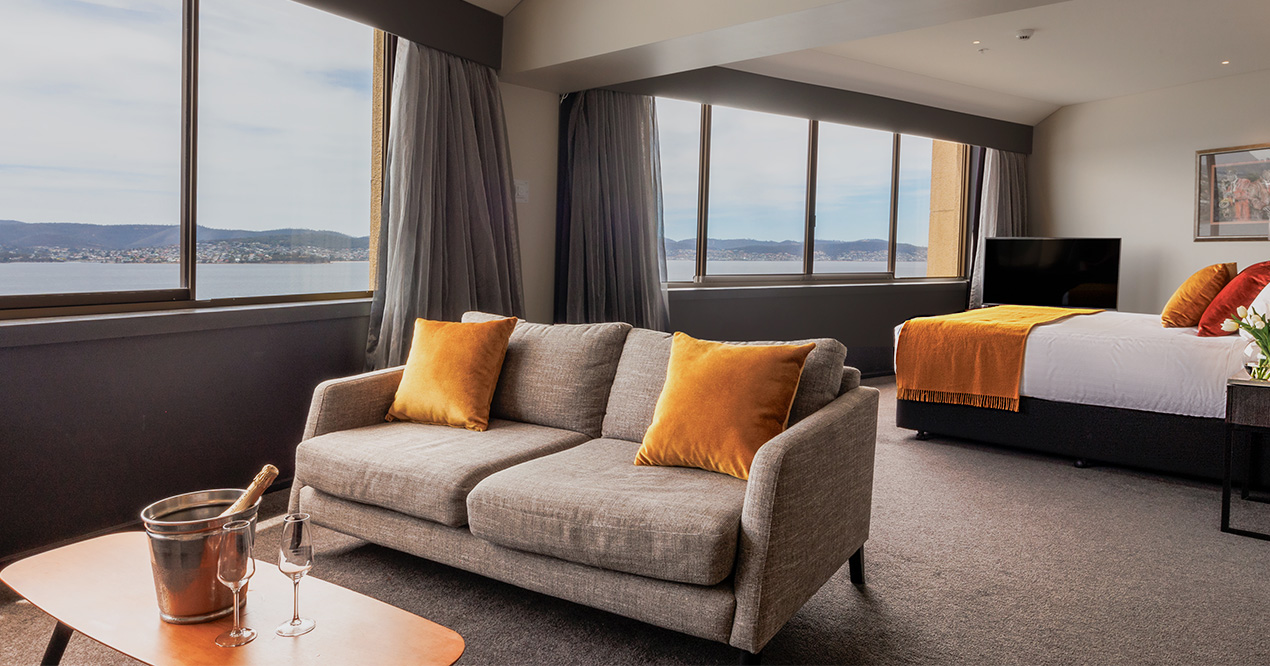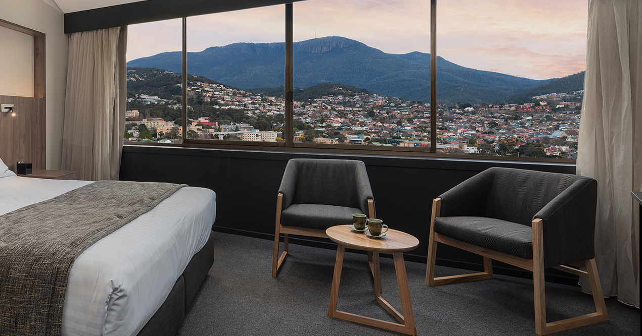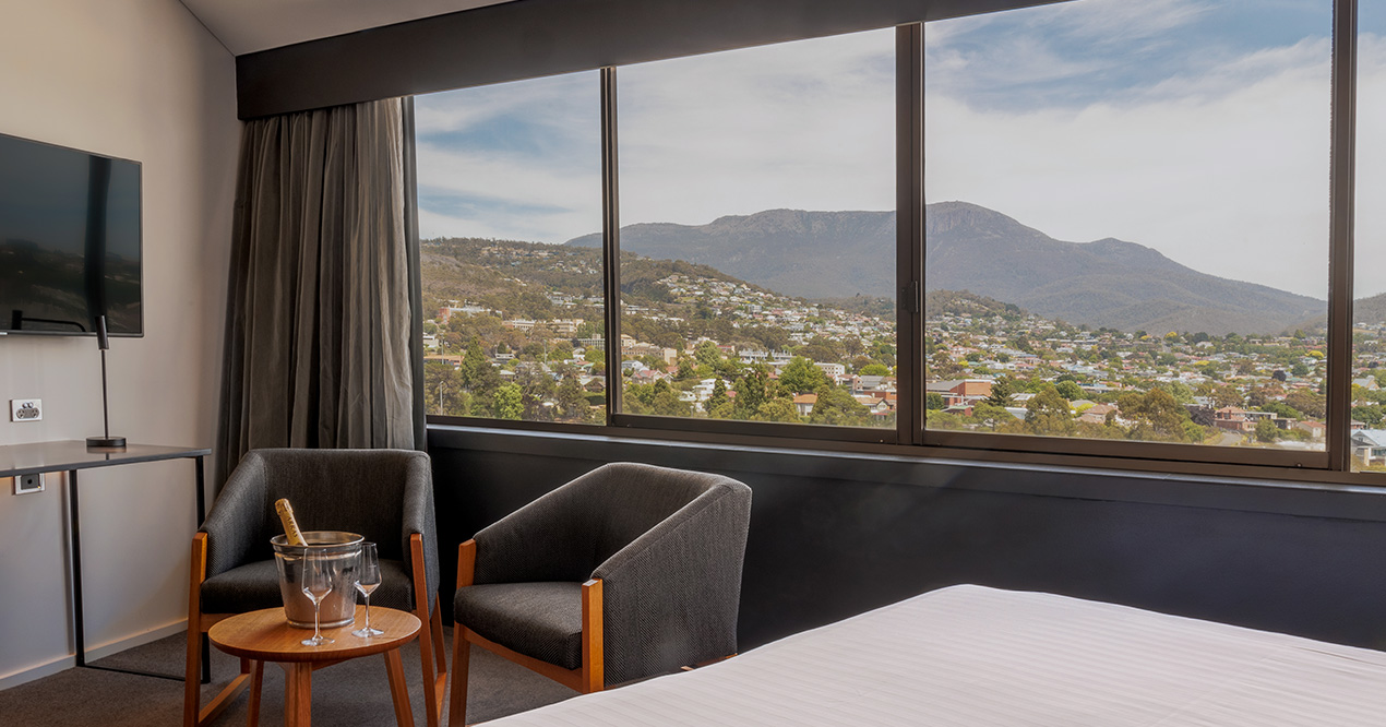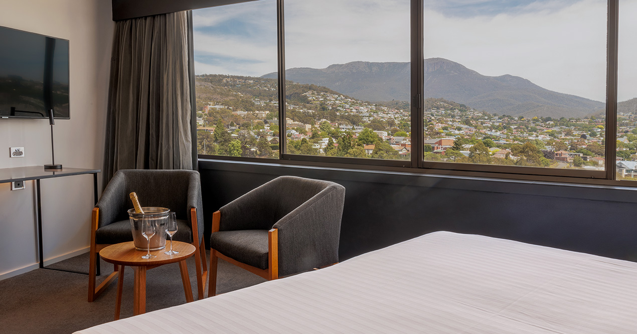 Elevate your stay. With an upper-level Tower room that takes in some of the best kunanyi / Mt Wellington and Hobart city views available. One spacious king bed in every room.