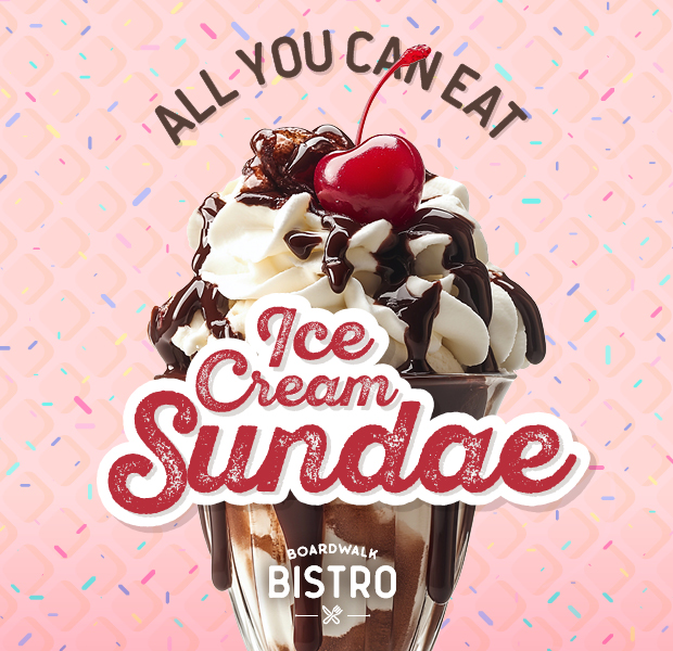 Indulge in endless ice cream sundaes at Boardwalk Bistro! With soft-serve ice cream, mix-ins, and a variety of delicious toppings, you can create your ultimate treat every time.